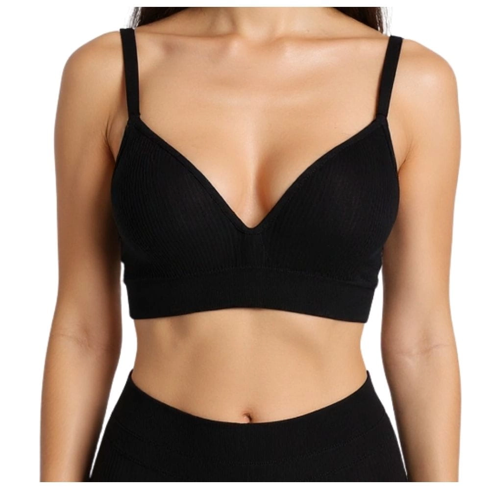 Biustonosz Bez Fiszbin Push-up Czarny z Prążkowanej Dzianiny to idealne połączenie wygody i efektownego wyglądu. Dzięki uniwersalnemu fasonowi sprawdzi się zarówno na co dzień, jak i pod bardziej dopasowaną stylizację, podkreślając naturalne kształty i zapewniając komfort przez cały dzień.