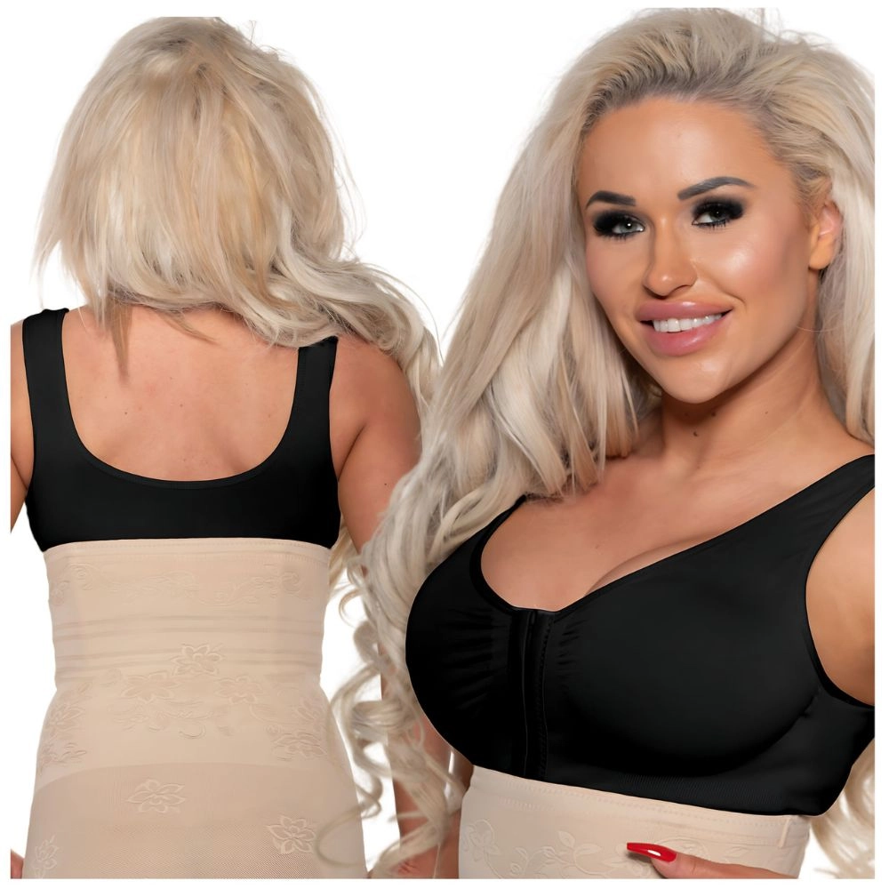 Biustonosz damski czarny, zapinany z przodu, bez fiszbin. Wykonany z elastycznego, modelującego materiału, zapewnia maksymalny komfort i styl na co dzień.