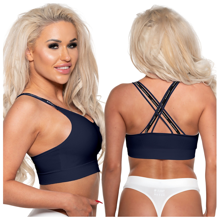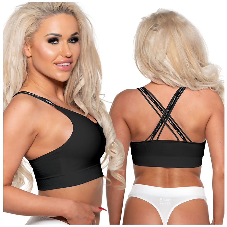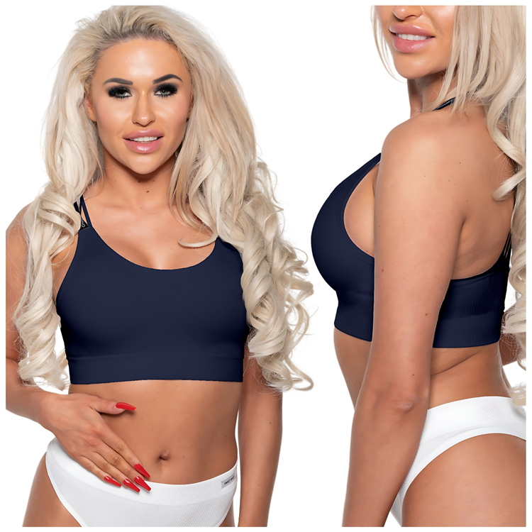 Stanik sportowy na ramiączkach złożonych z pasków, dostępny w trzech wariantach kolorystycznych.