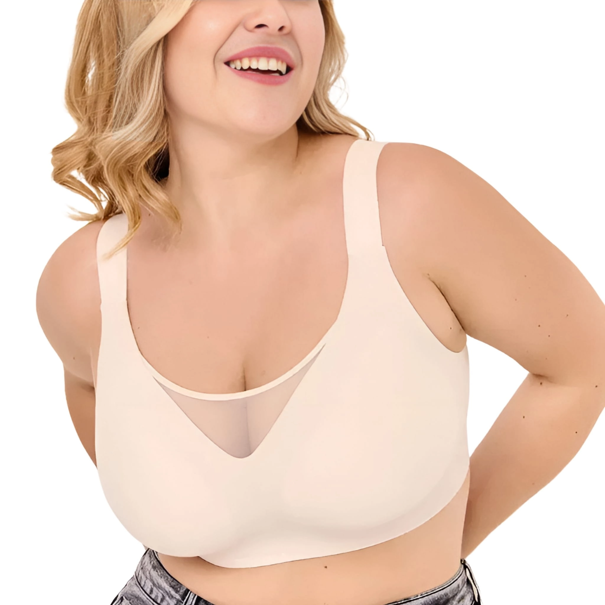 Eleganckiego wyglądu dodaje transparentna siateczka przy dekolcie, która nie tylko podkreśla biust, ale również nadaje lekkości całemu fasonowi. Bezszwowy design sprawia, że biustonosz nie odznacza się nawet pod dopasowanym ubraniem, a regulowane, szerokie ramiączka zapewniają stabilność przez cały dzień.