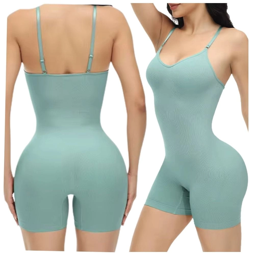 Eleganckie body damskie modelujące w odcieniu mięty z krótkimi nogawkami i regulowanymi ramiączkami. Bezszwowa konstrukcja i elastyczny materiał zapewniają wygodę i skuteczne modelowanie sylwetki.