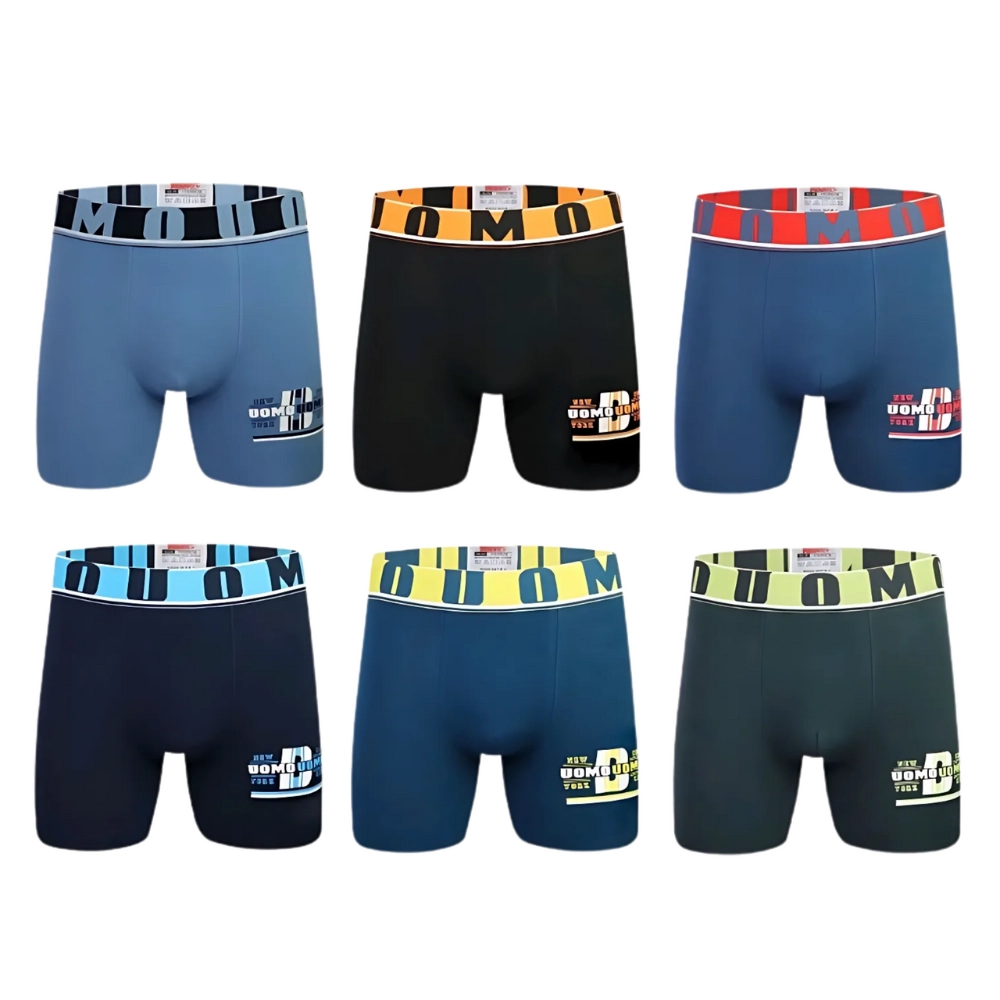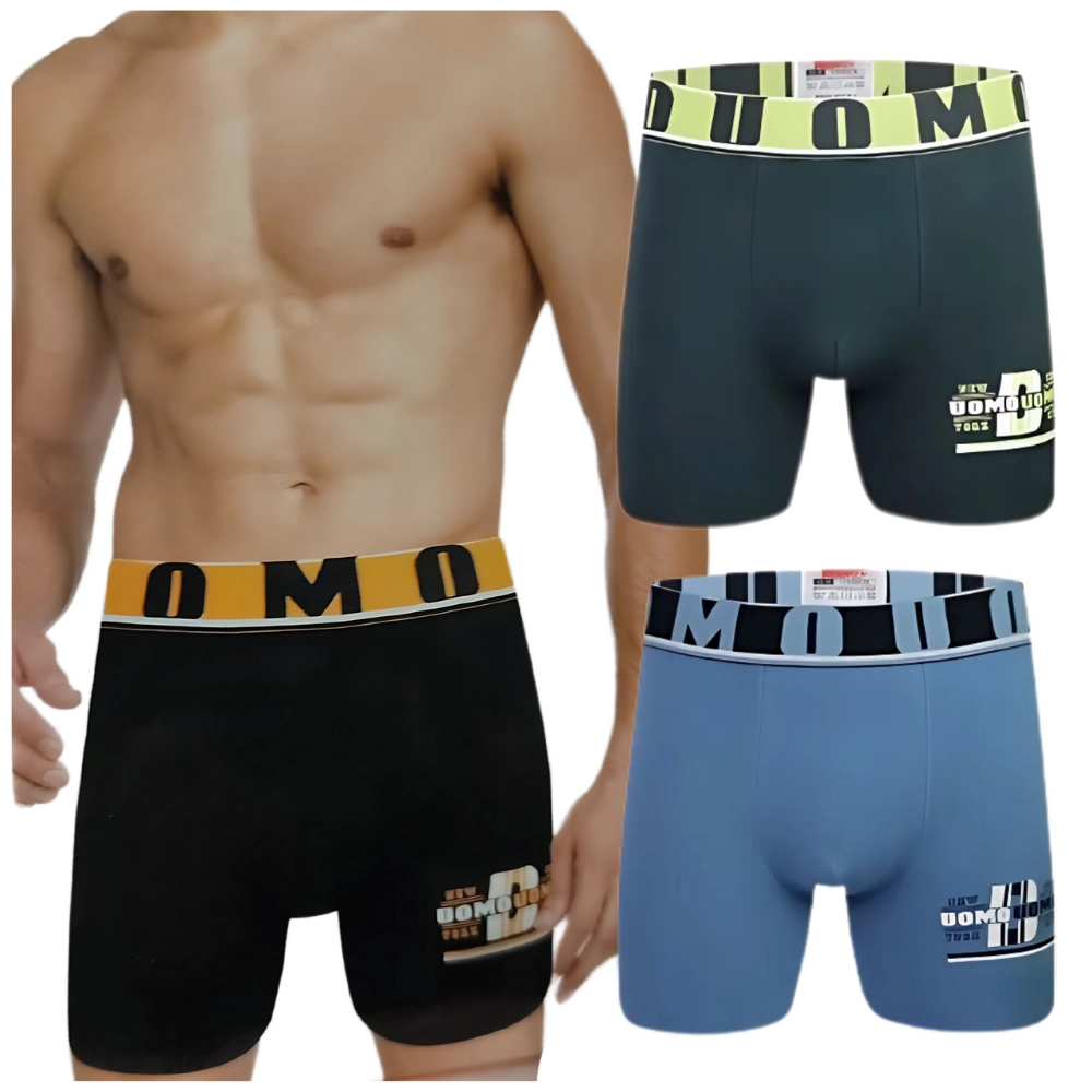 Estetyczne detale, takie jak kontrastowa guma w pasie z dużym napisem „UOMO” oraz subtelny nadruk z boku nogawki, dodają charakteru. Dzięki wydłużonej nogawce bokserki świetnie trzymają się na miejscu i nie podwijają się podczas ruchu, co zwiększa ich funkcjonalność i komfort noszenia.