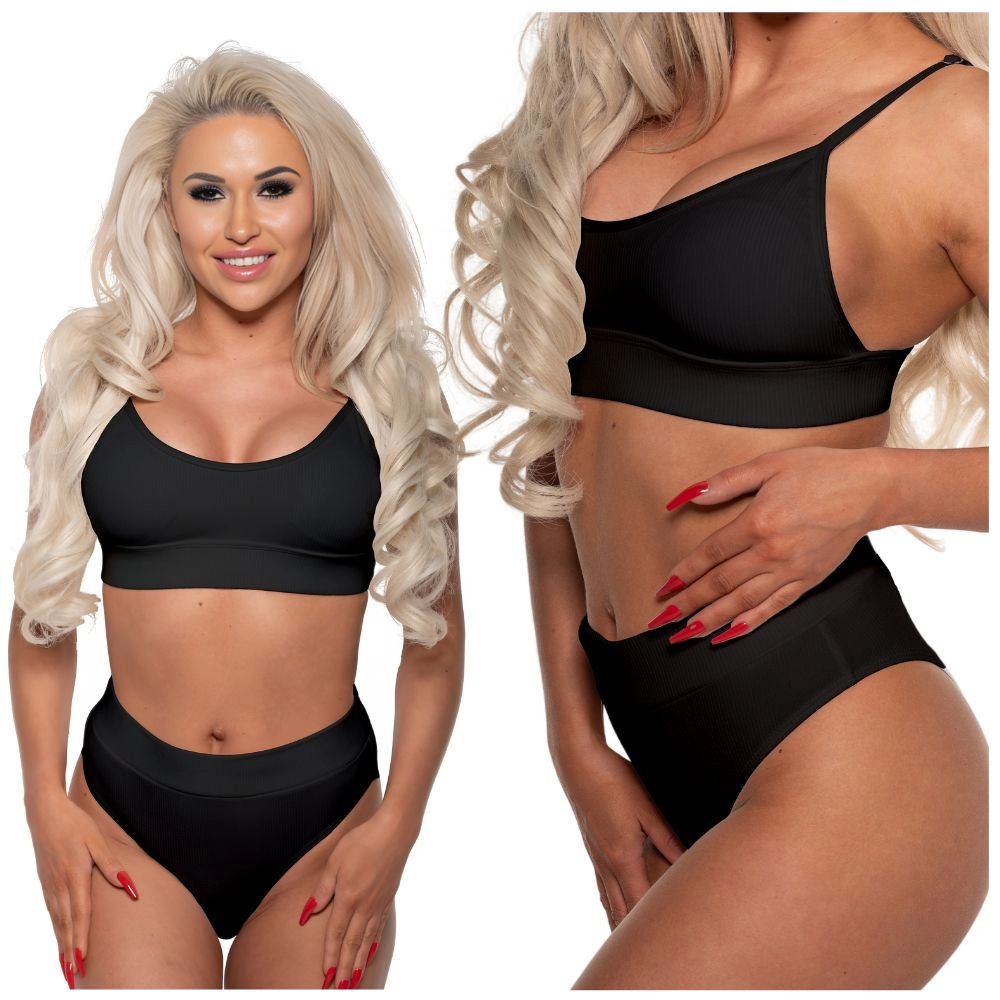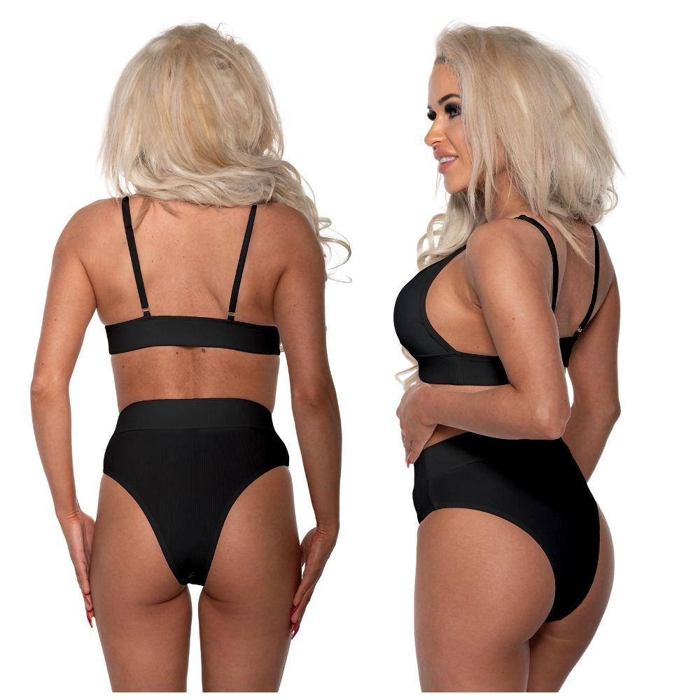 Czarny dwuczęściowy strój kąpielowy z prążkowanego materiału, z biustonoszem na ramiączkach i majtkami z wysokim stanem.