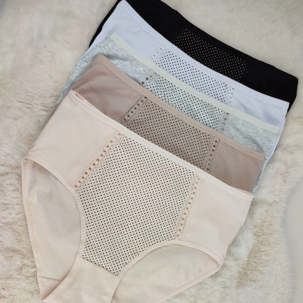 Wygodne majtki damskie figi z naturalnej bawełny, ozdobione kropeczkami i ażurowymi detalami. Zestaw 6 sztuk zapewni Ci styl i komfort na każdy dzień.