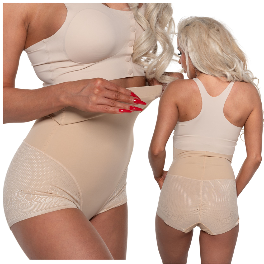 Majtki korygujące i modelujące, dostępne w beżowym kolorze.