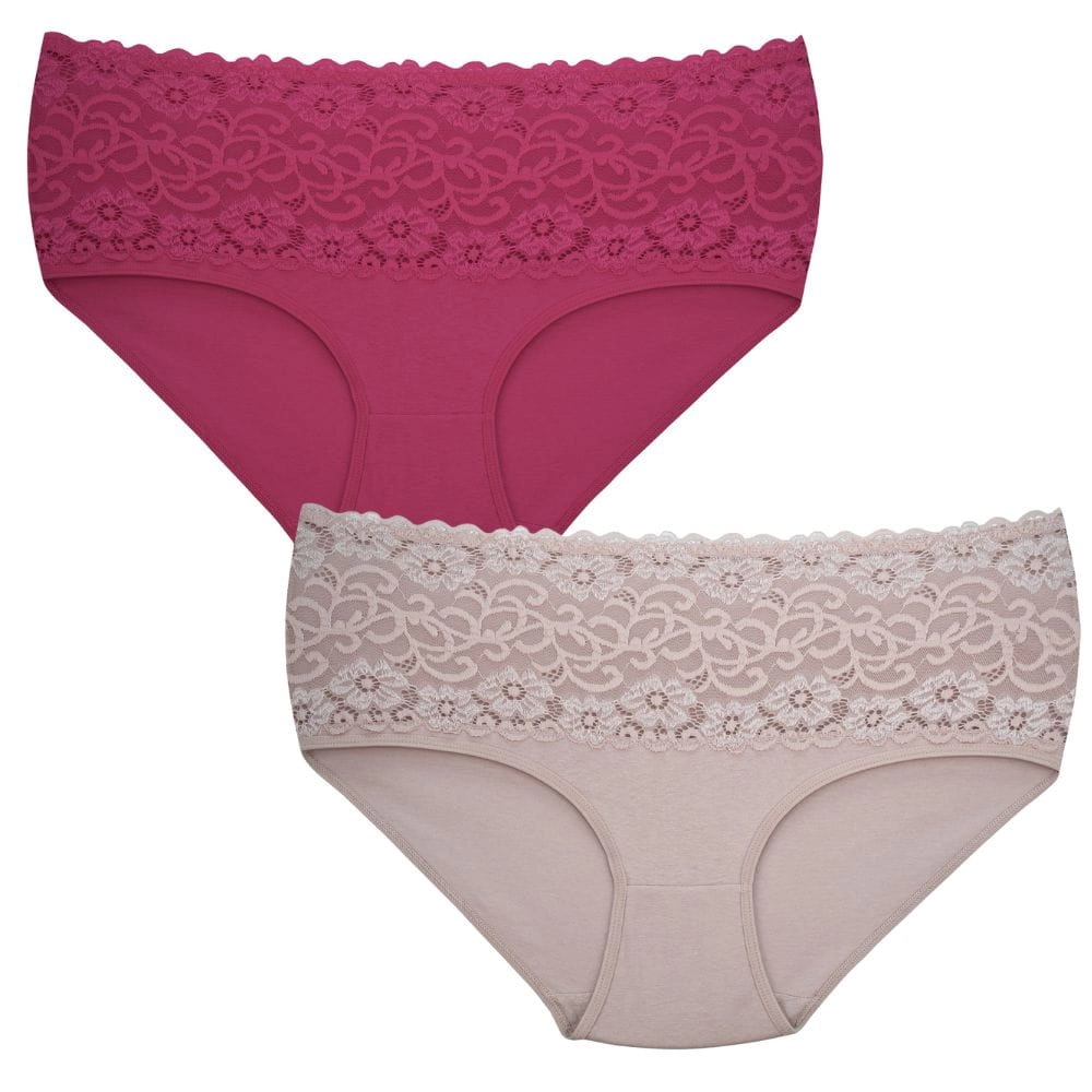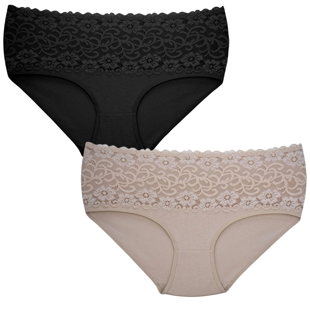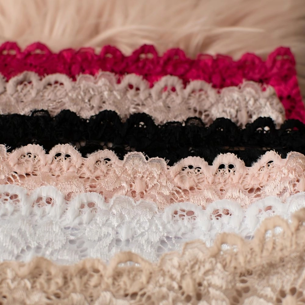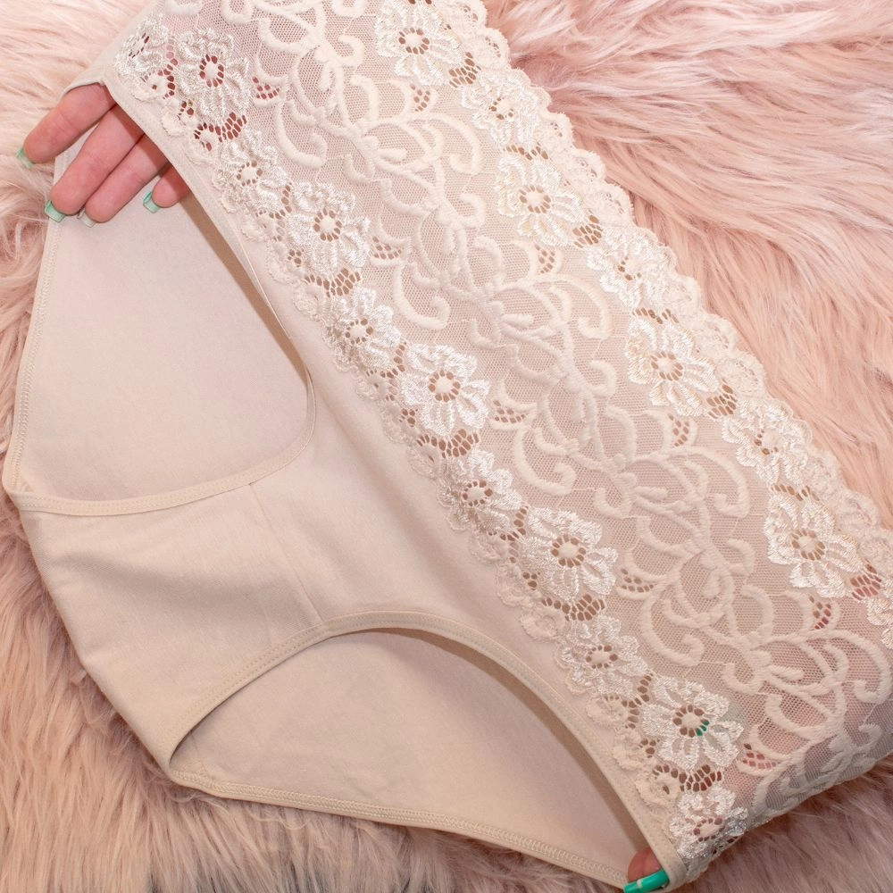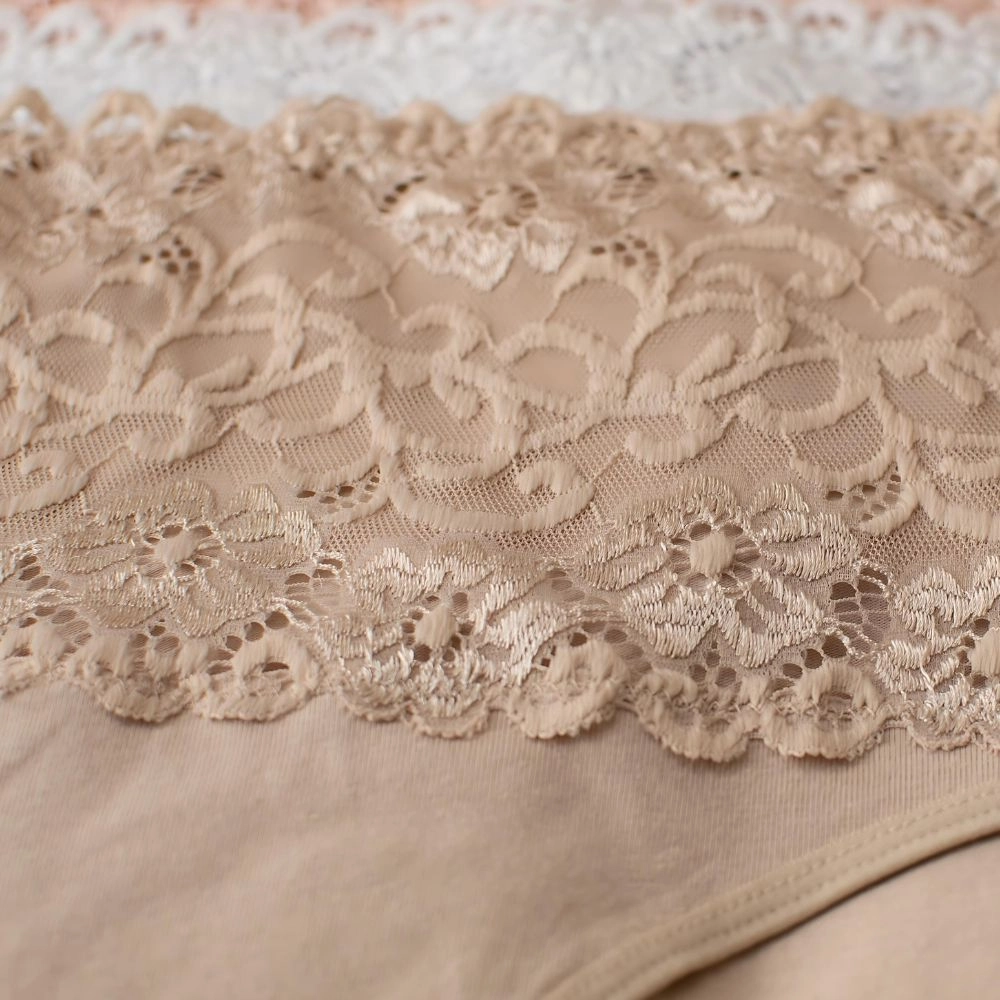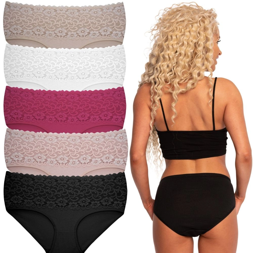 Zestaw 5 par majtek z wysokim stanem i koronkowym wykończeniem w różnych kolorach.