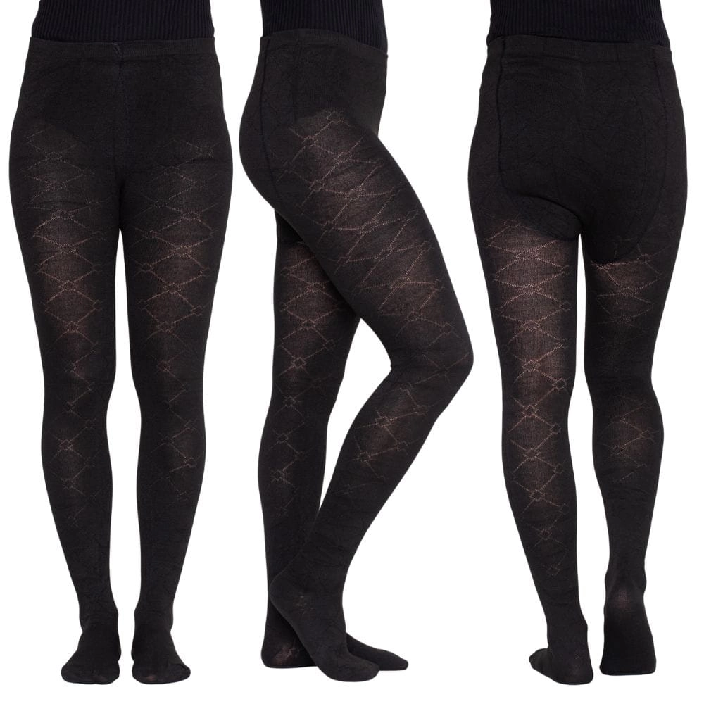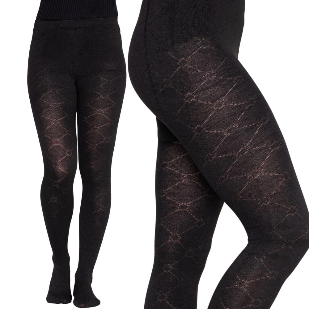 Rajstopy damskie w kolorze czarnym z eleganckim wzorem w romby. Wykonane z elastycznego materiału, zapewniają komfort i doskonałe dopasowanie.
