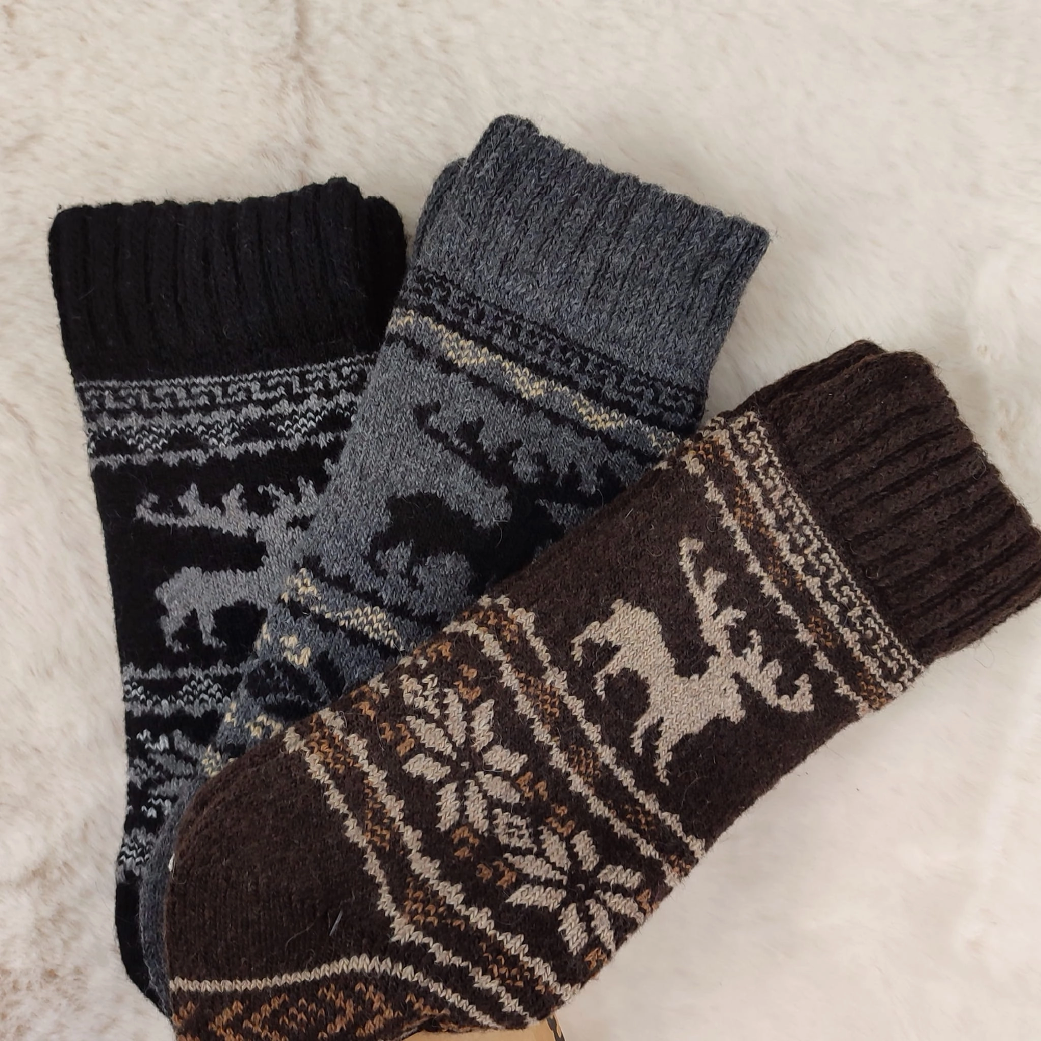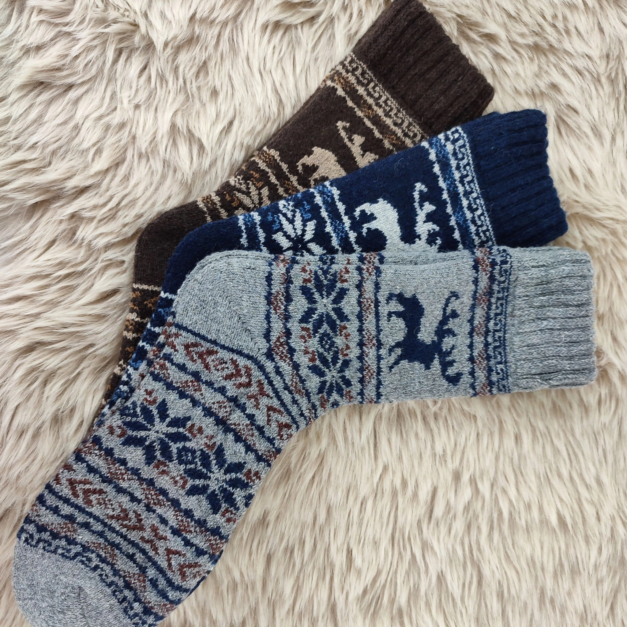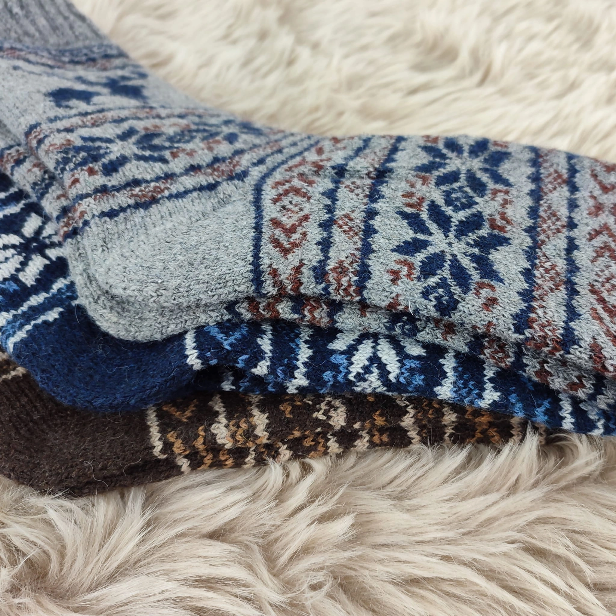 Ciepłe skarpety z alpaki wykonane z grubej dzianiny z zimowym wzorem. Bezuciskowe, elastyczne i wyjątkowo komfortowe – idealne na prezent lub zimowe dni.