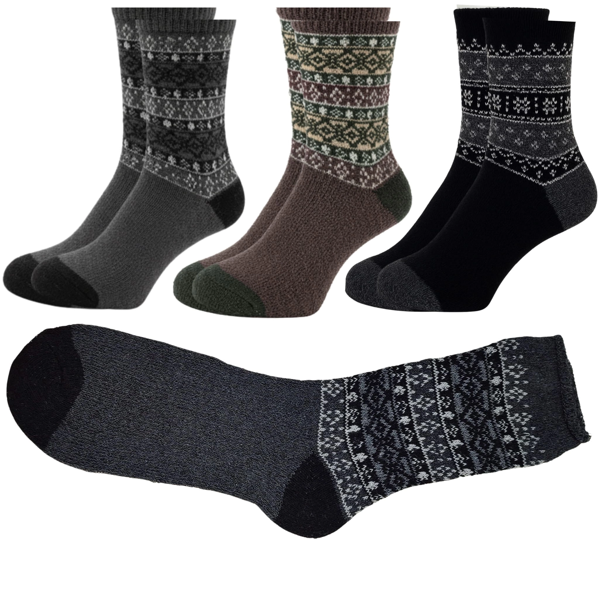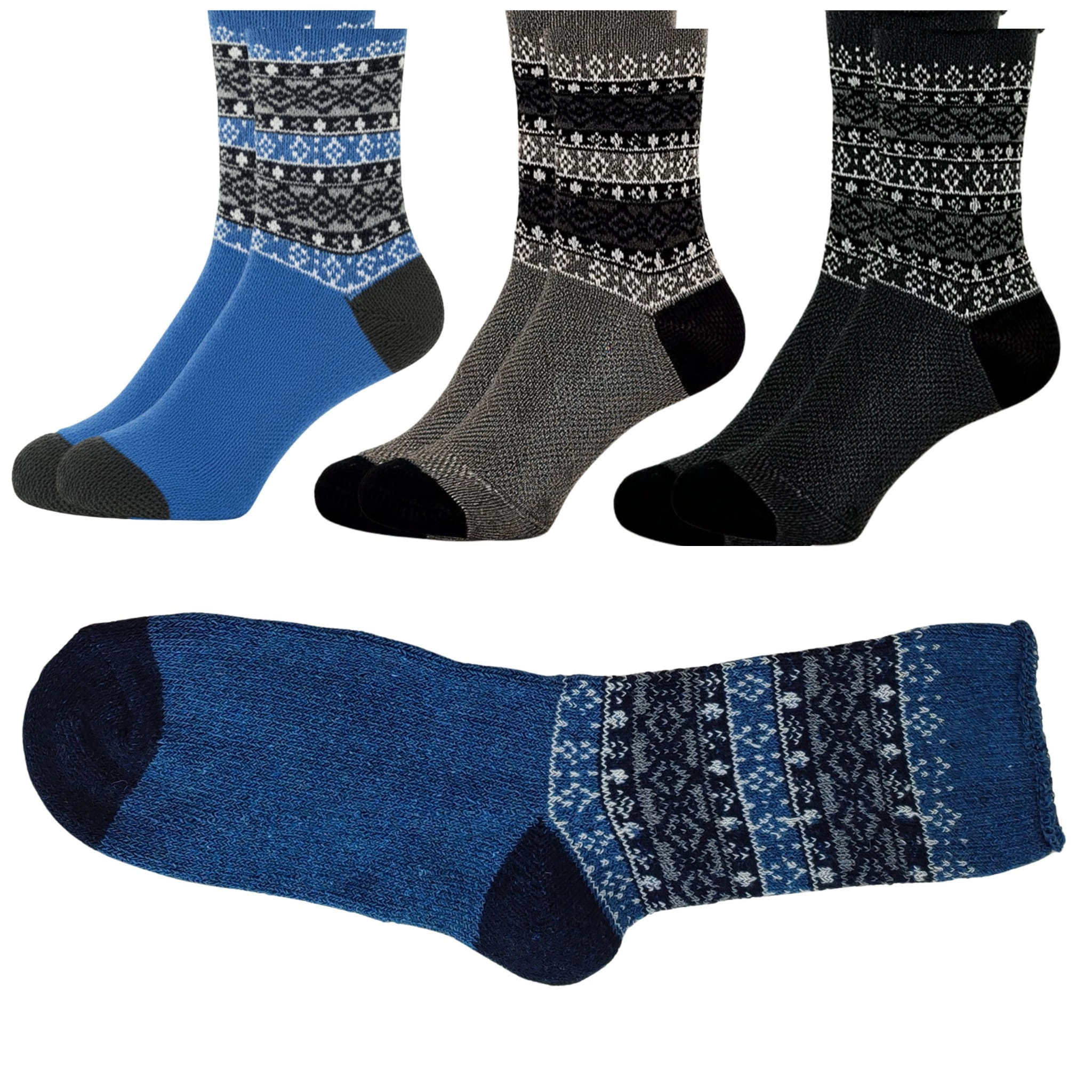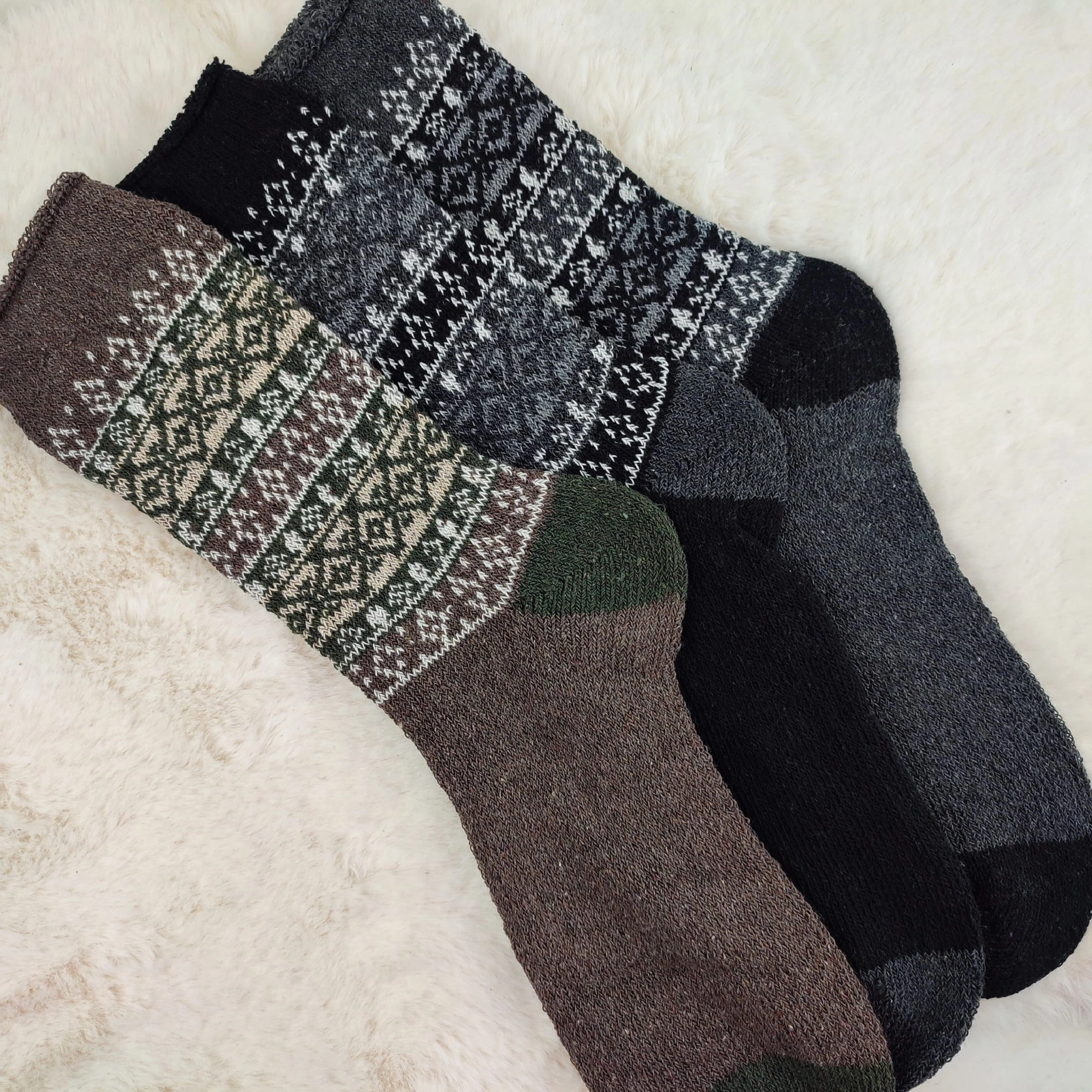 Grube, ciepłe i w 100% wełniane – idealne skarpety męskie zimowe na największe mrozy. Dostępne w dwóch kolorystycznych zestawach z klasycznym norweskim wzorem.