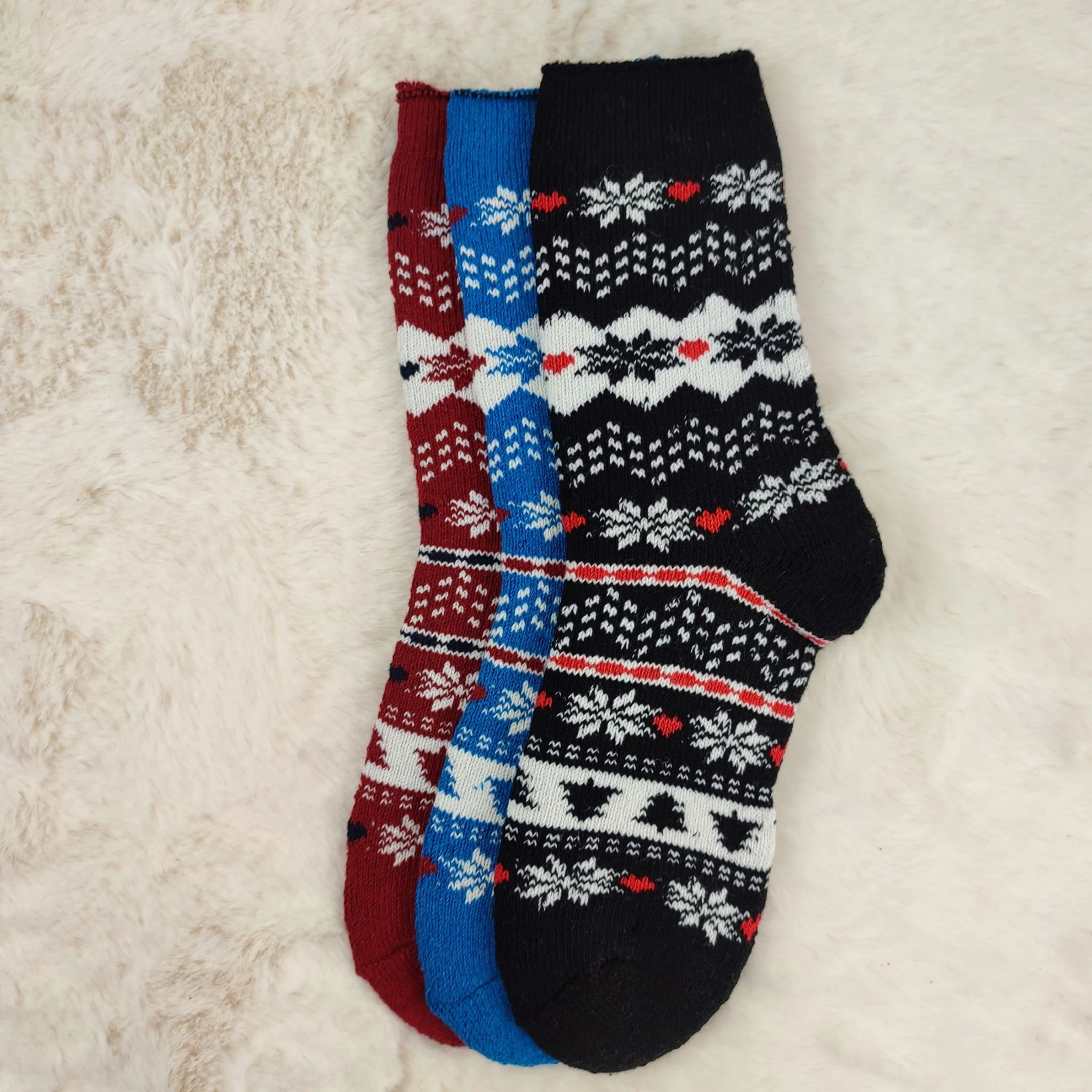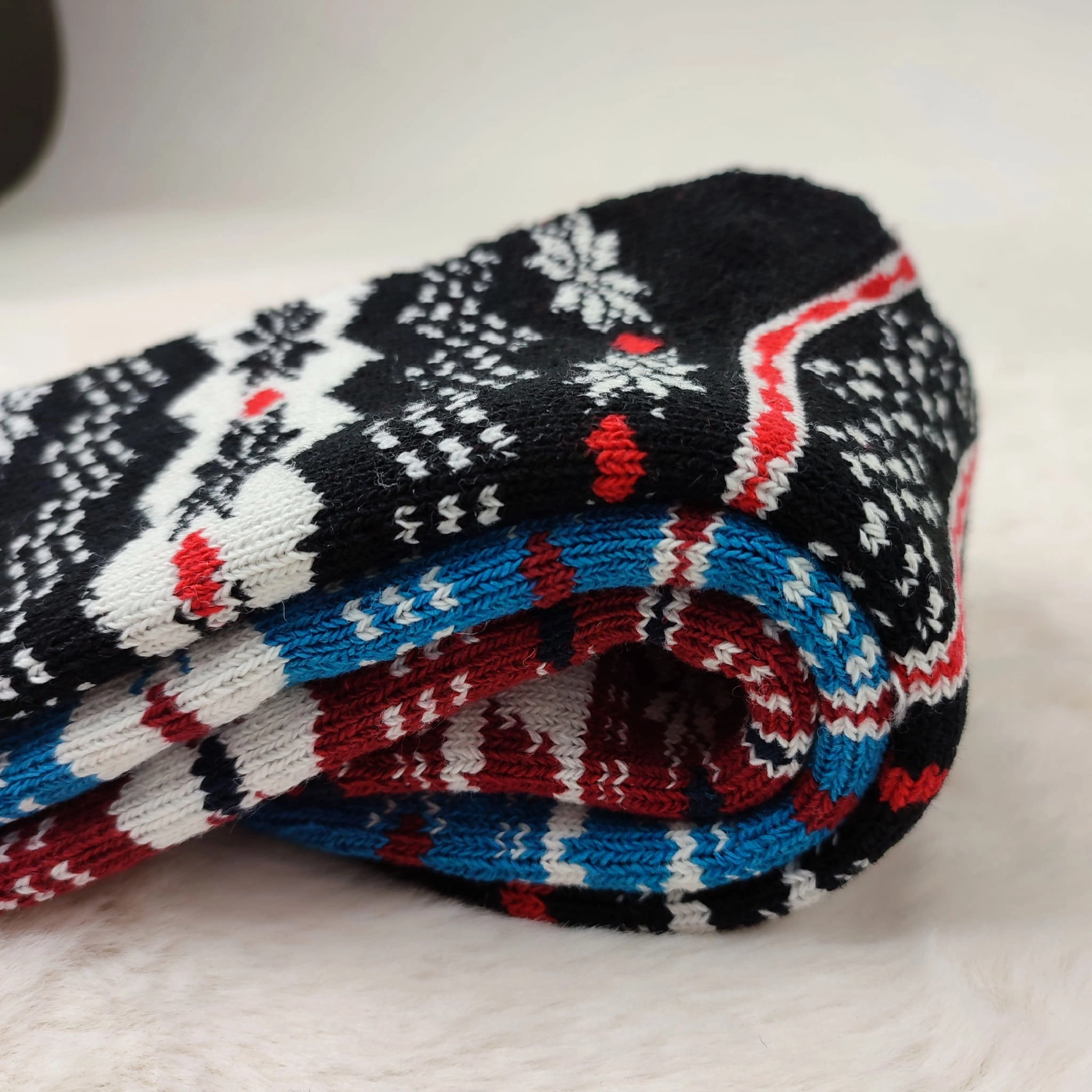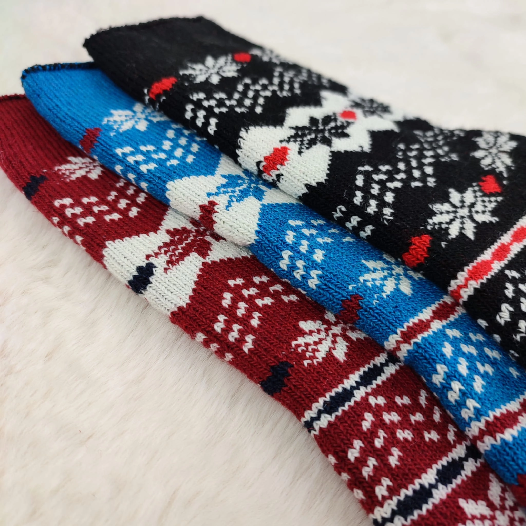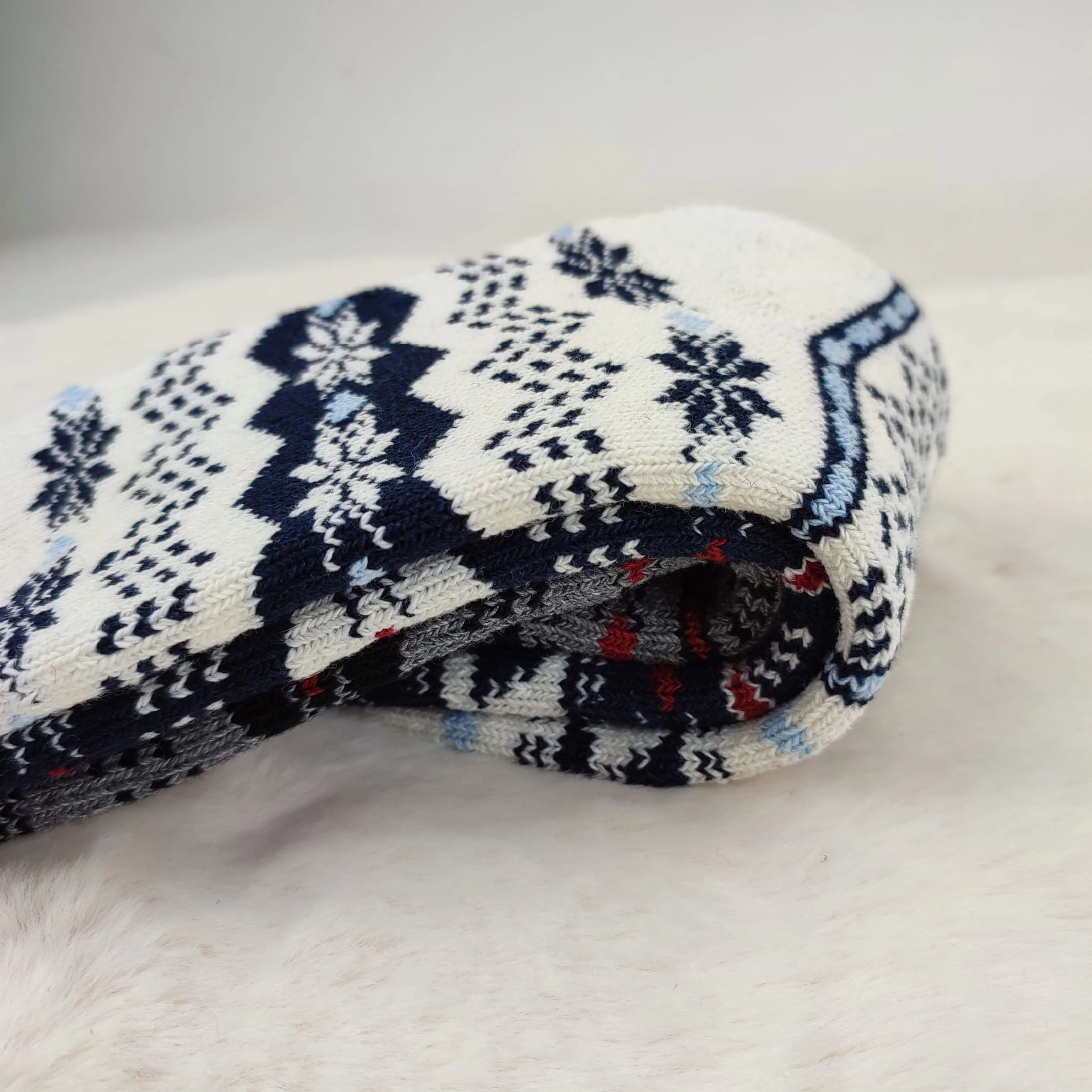 Ciepłe i wygodne skarpetki wełniane z zimowym wzorem śnieżynek. Idealne na zimę, do domu lub jako prezent.