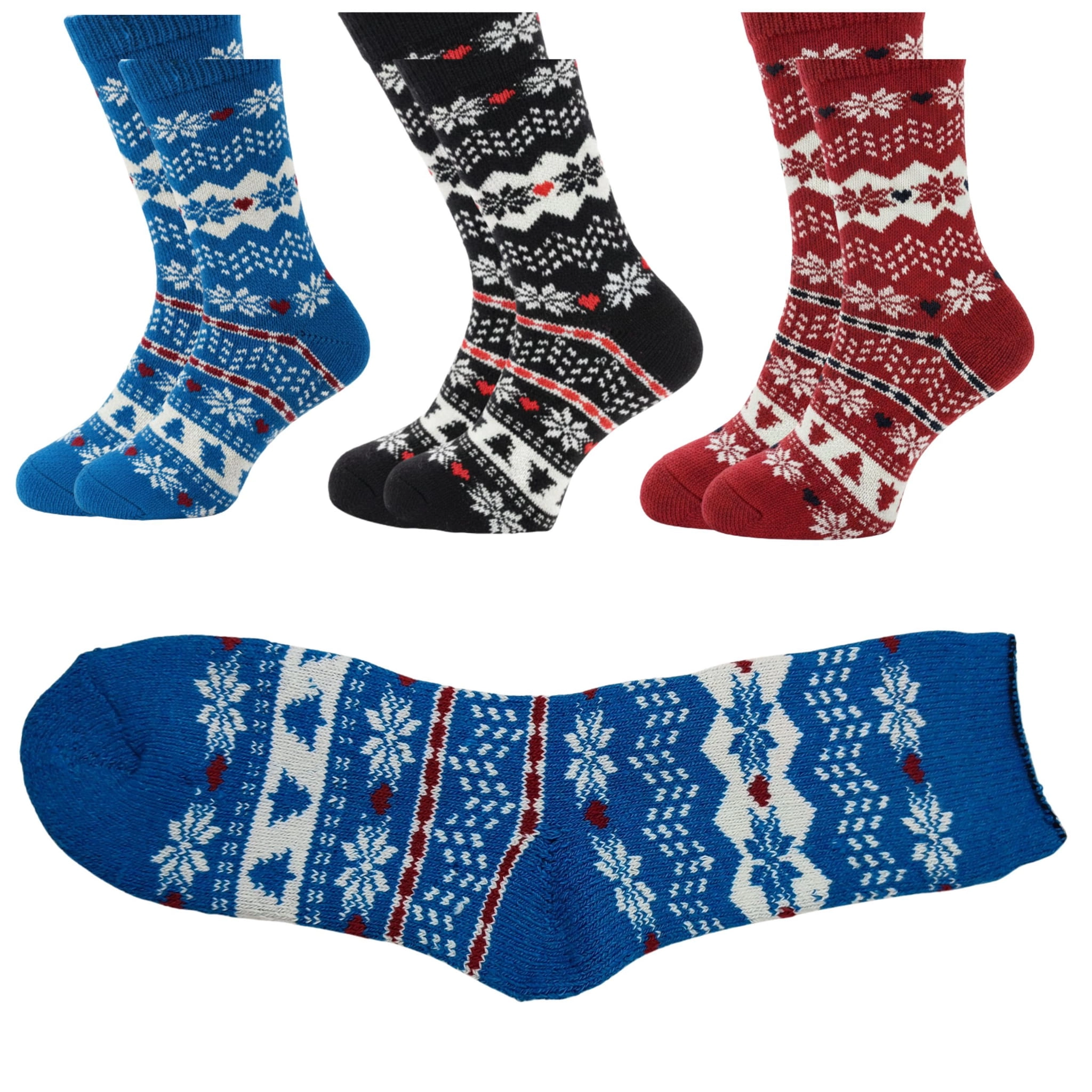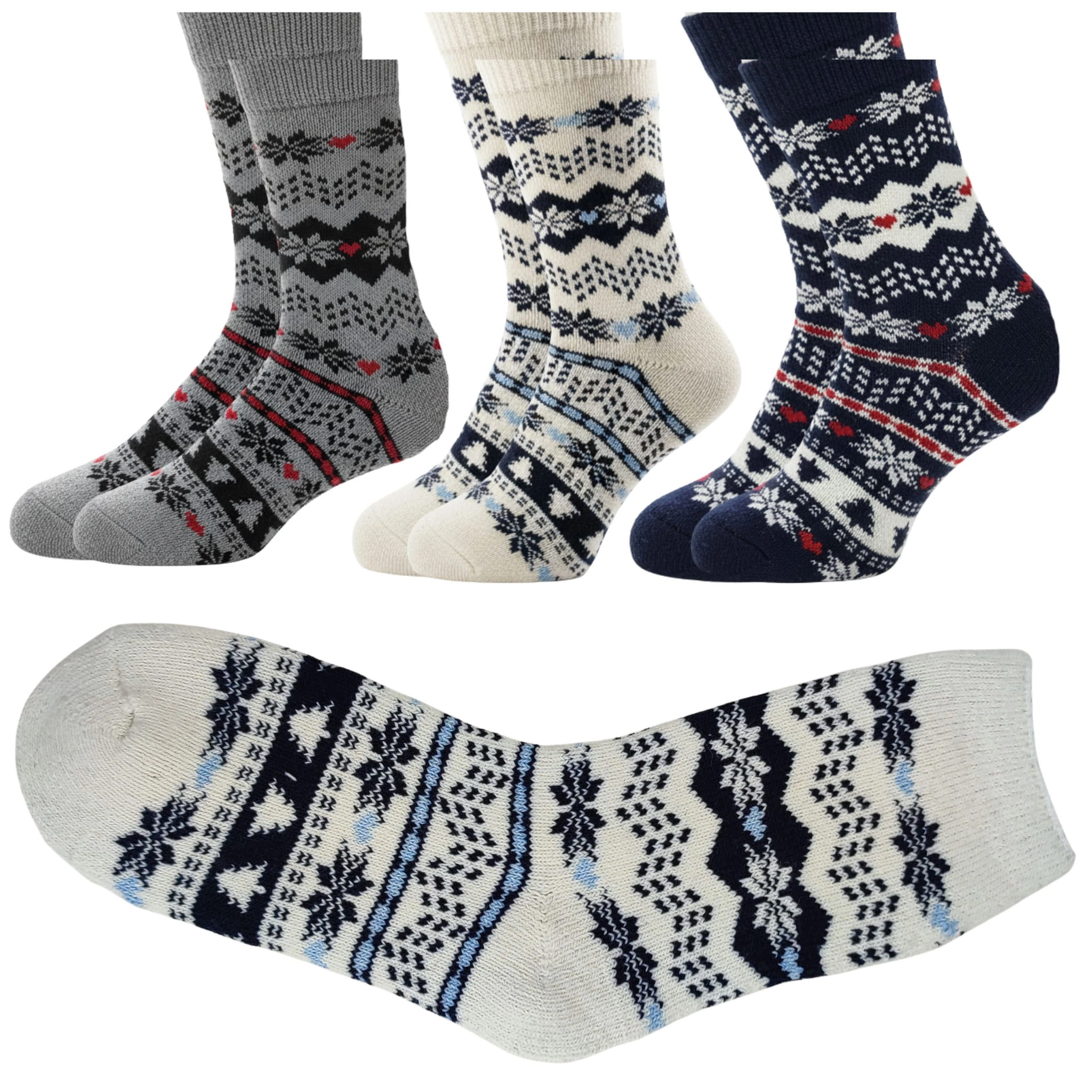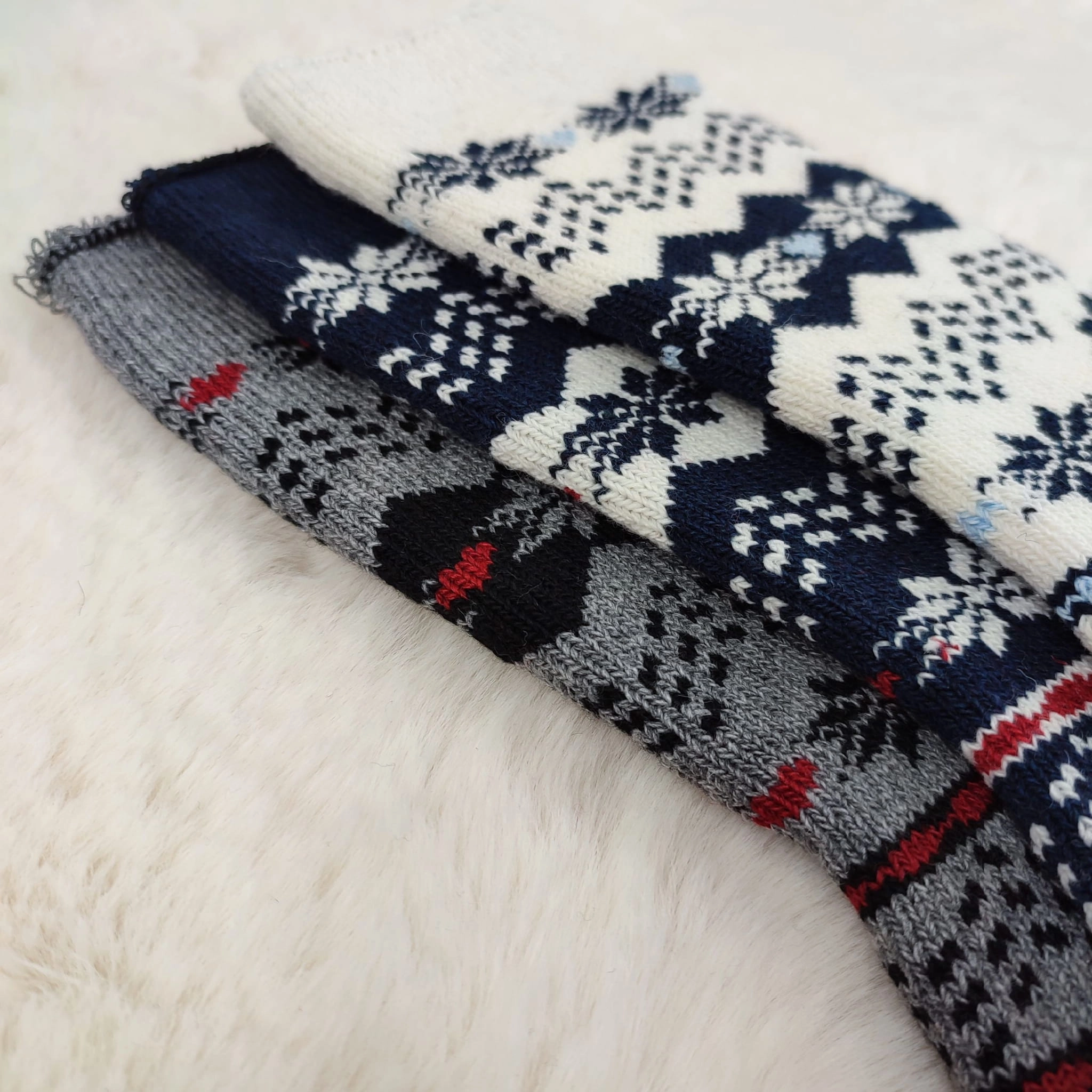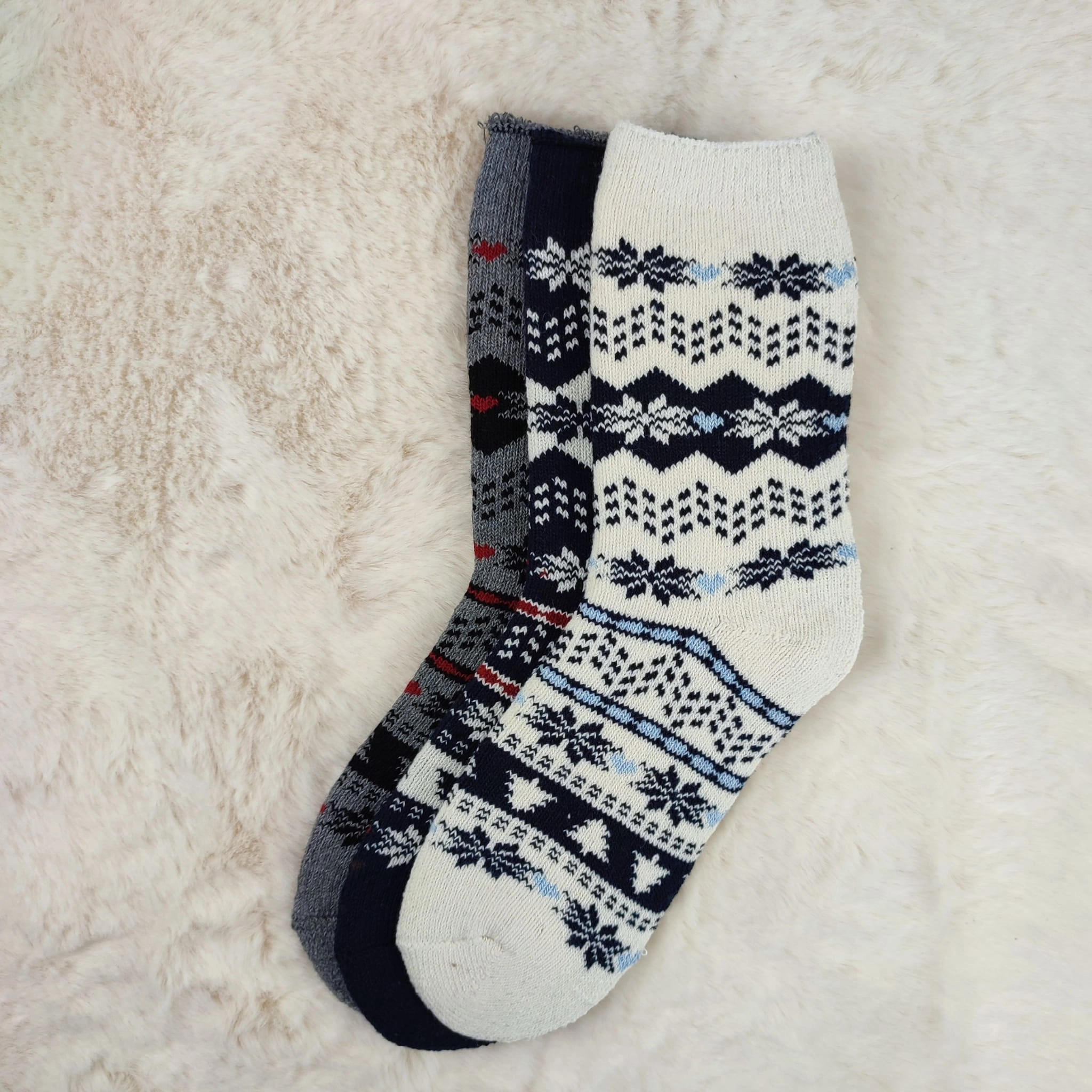 Ciepłe i wygodne skarpetki wełniane z zimowym wzorem śnieżynek. Idealne na zimę, do domu lub jako prezent.