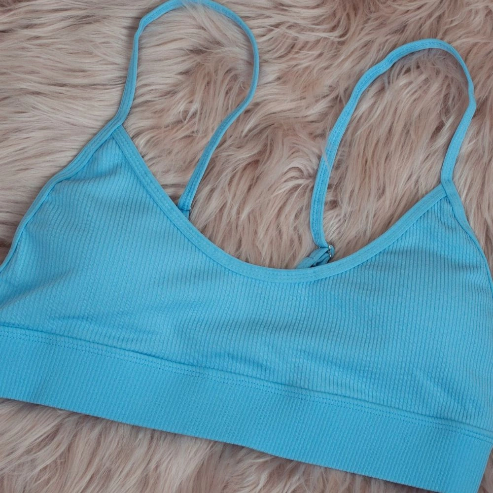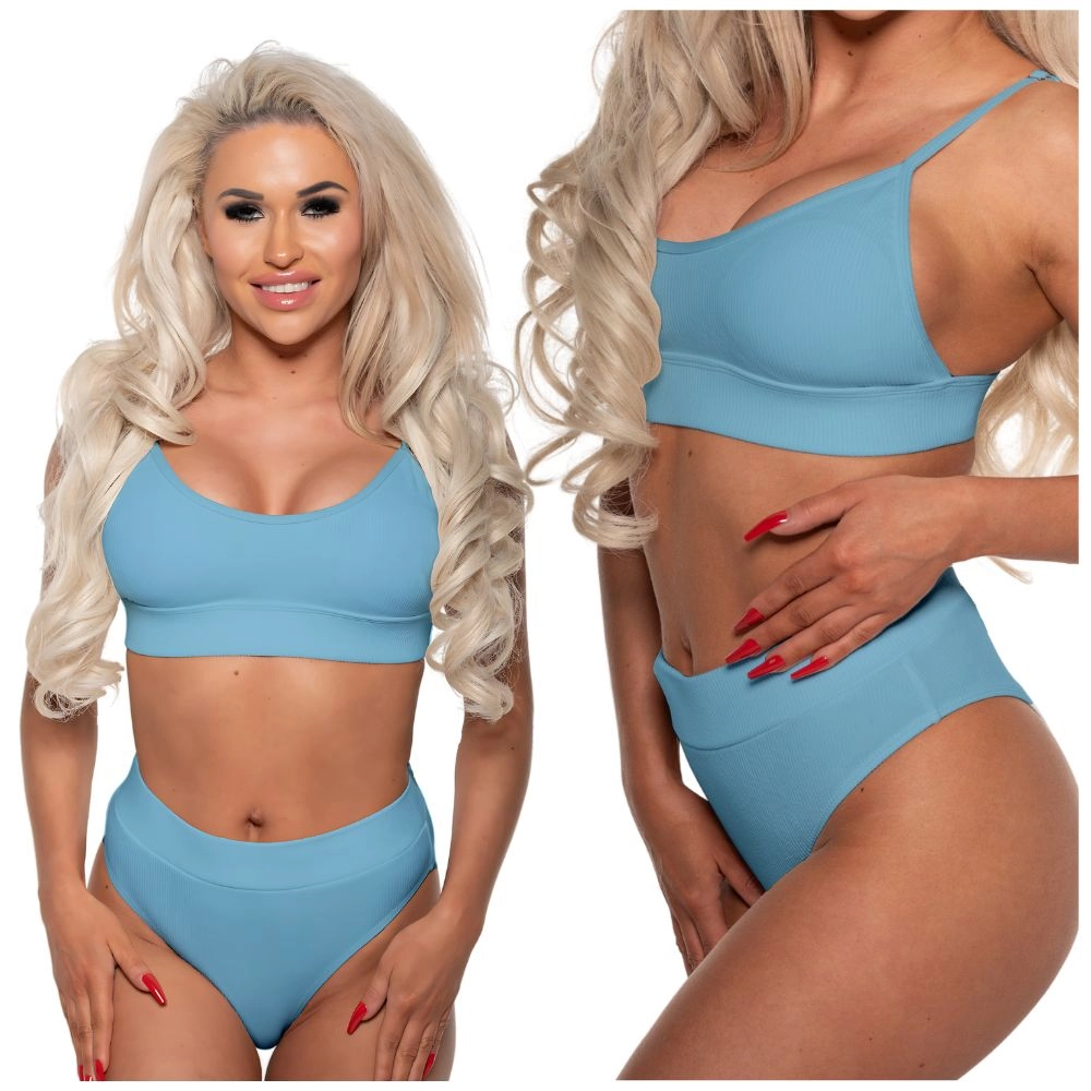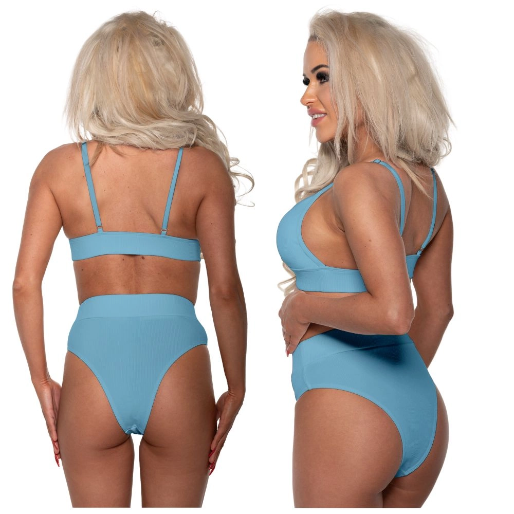 Niebieski dwuczęściowy strój kąpielowy z prążkowanego materiału, z biustonoszem na ramiączkach i stringami.