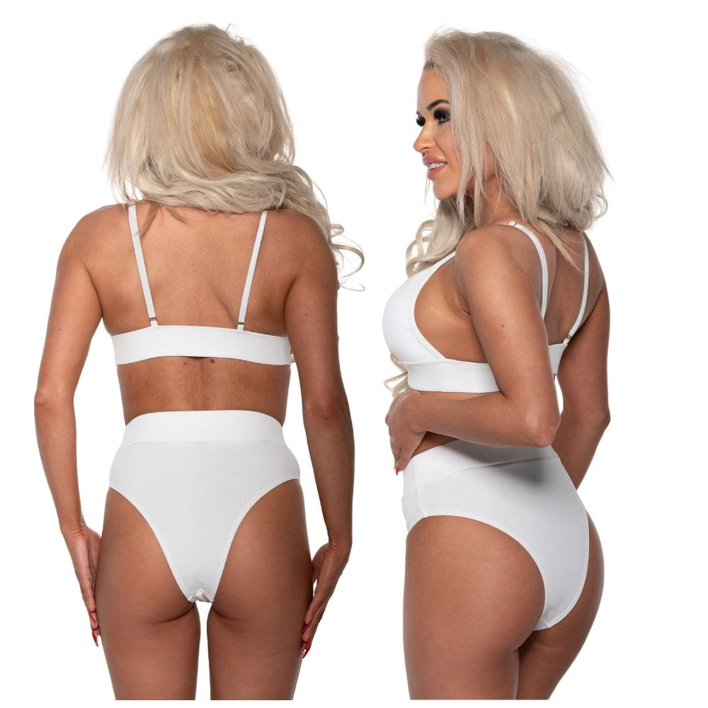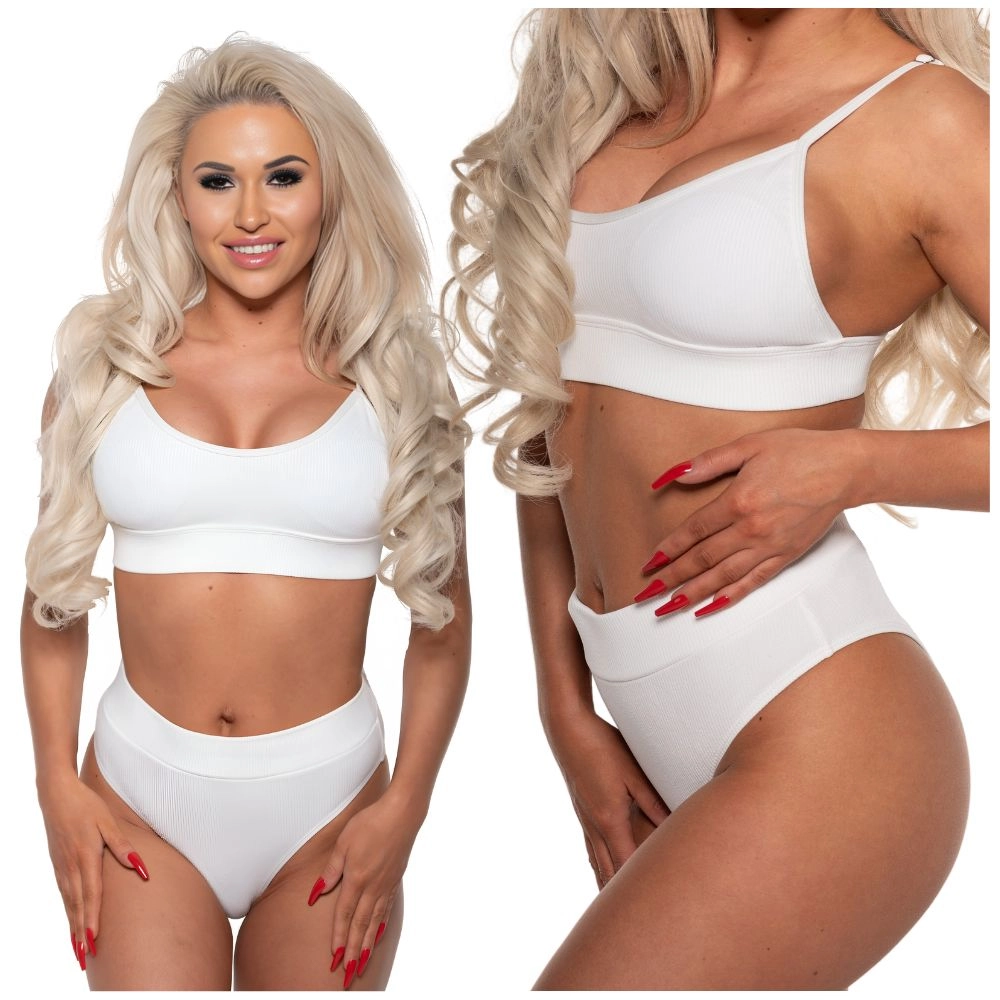 Biały strój kąpielowy z prążkowanego materiału, z biustonoszem na ramiączkach i majtkami z wysokim stanem.