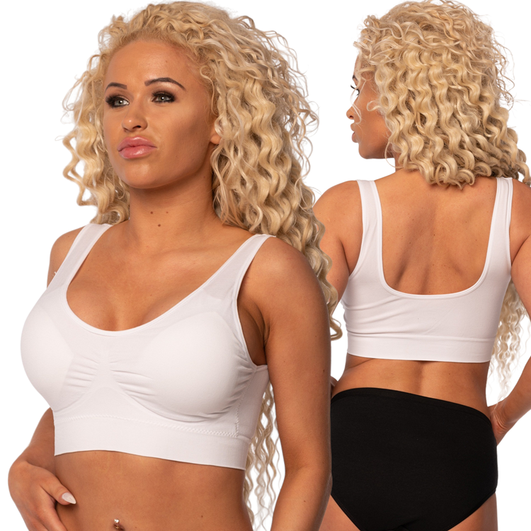 Biały biustonosz sportowy bezszwowy, idealny na treningi i codzienne aktywności. Zapewnia doskonałe podtrzymanie i wygodę przez cały dzień.