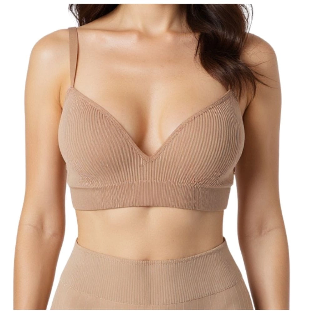 Wykonany z elastycznego i miękkiego materiału o prążkowanej strukturze, biustonosz doskonale układa się na ciele. Brak fiszbin gwarantuje wygodę przez cały dzień, eliminując uczucie ucisku, a delikatne miseczki typu push-up podkreślają naturalny kształt biustu.